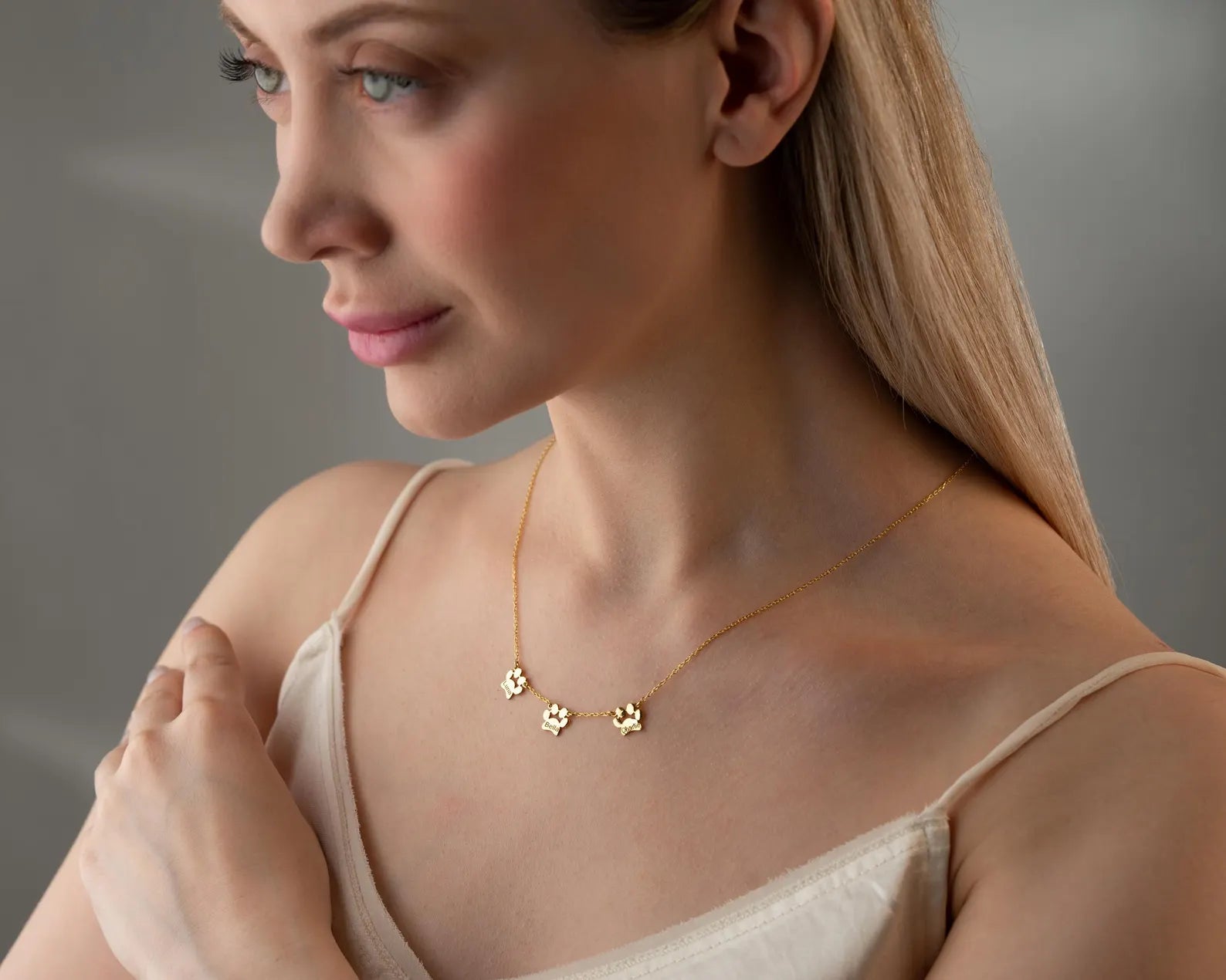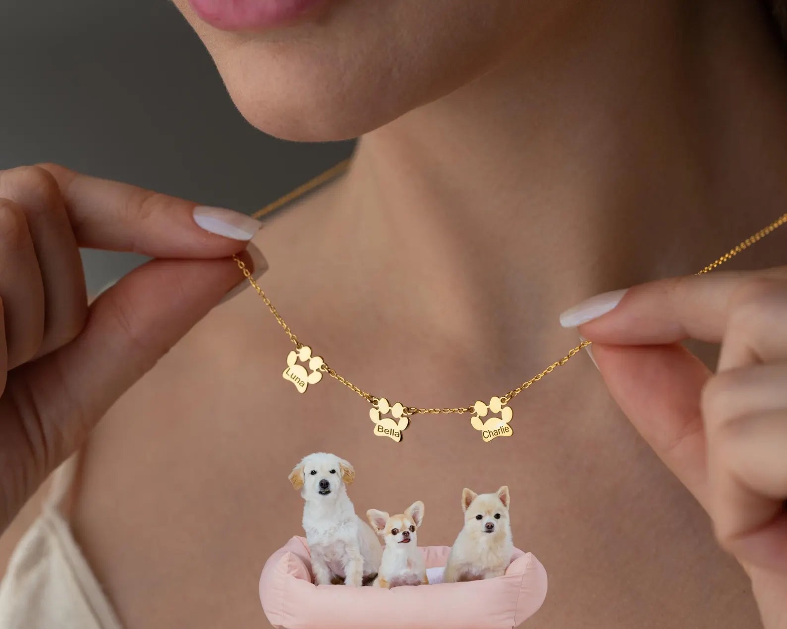 Celebrate the love, loyalty, and laughter your furry friends bring with our Personalized Paw Print Name Necklace. Handcrafted from premium 925 Sterling Silver and available in luxurious Gold, Rose Gold, or Silver finishes, this necklace features dainty paw charmsโeach custom-engraved with your petโs name.